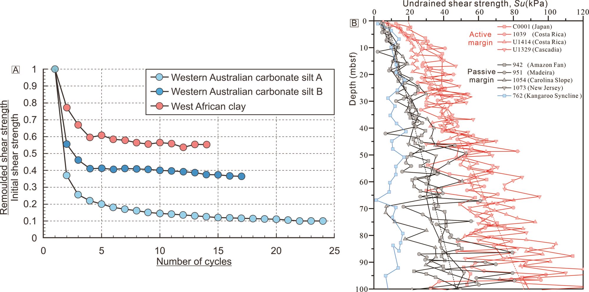 图2(A)碳酸盐软泥在循环 T-bar 贯入试验中的剪切强度快速下降。(B)大洋钻探计划(ODP)和综合大洋钻探计划(IODP)获得的沉积物不排水剪切强度随深度变化特征数据。点位包括包括日本外海(IODP C0001)、卡斯卡迪亚(IODP U1329)以及哥斯达黎加外海两个站位(ODP Site 1039 和 IODP U1414)、亚马逊扇(ODP Site 942)、马德拉深海平原(ODP Site 951)、新泽西(ODP Site 1073)、卡罗来纳斜坡(ODP Site 1054)以及 Kangaroo Syncline(ODP Site 762)