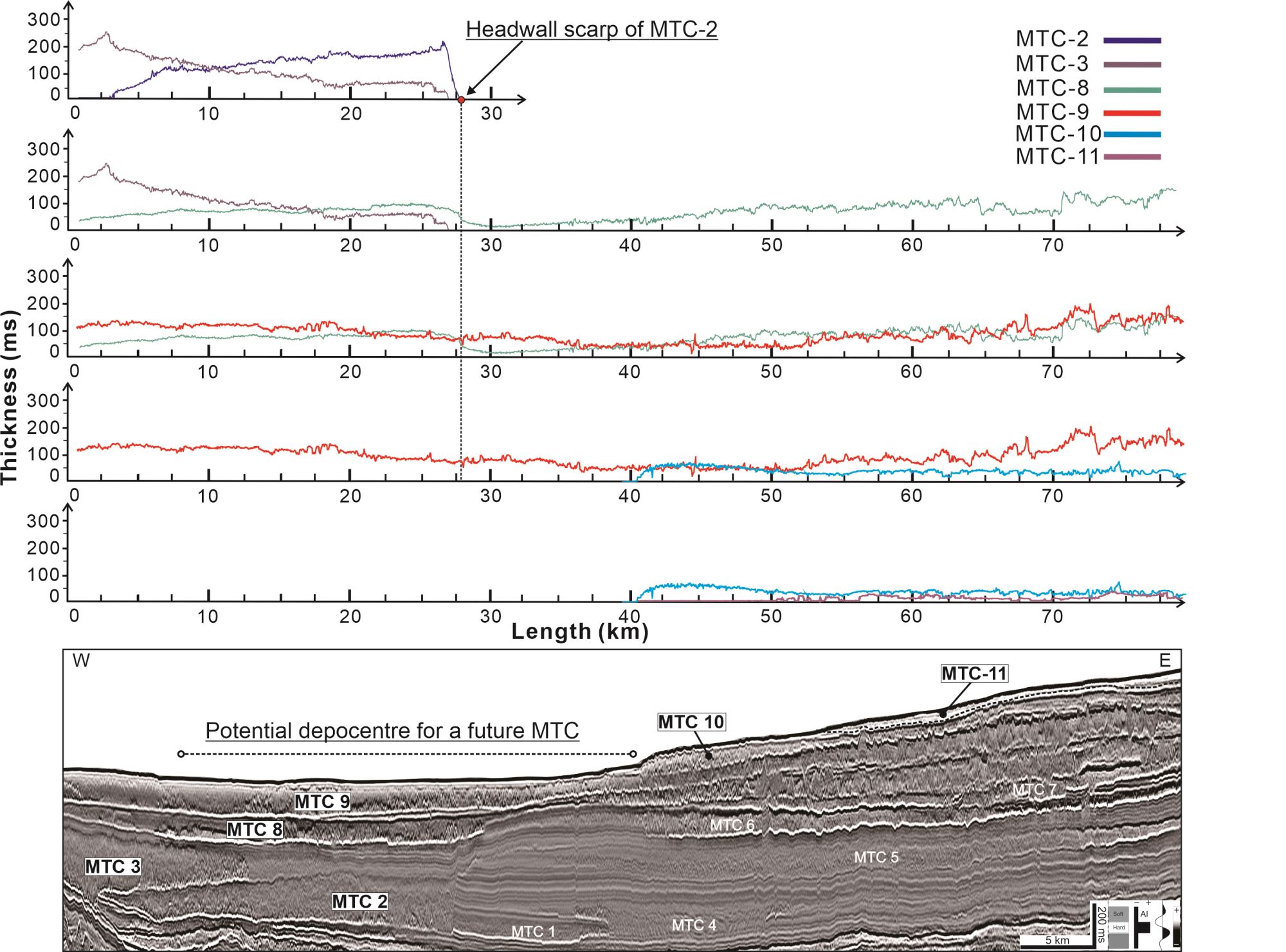 图4 纵向叠置海底滑坡之间的厚度分布关系示意图。新滑坡在老滑坡较厚区域厚度通常较小,反之亦然