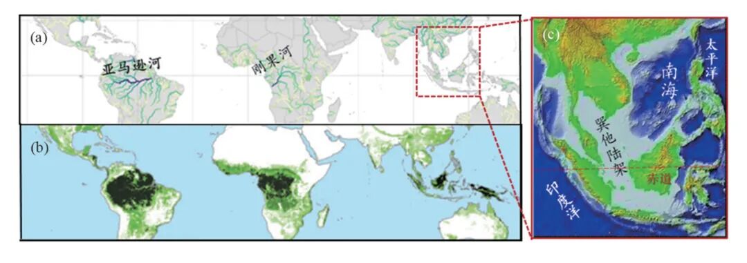 (a)地理位置与河系分布;(b)热带树林植被分布;(c)巽他陆架位置