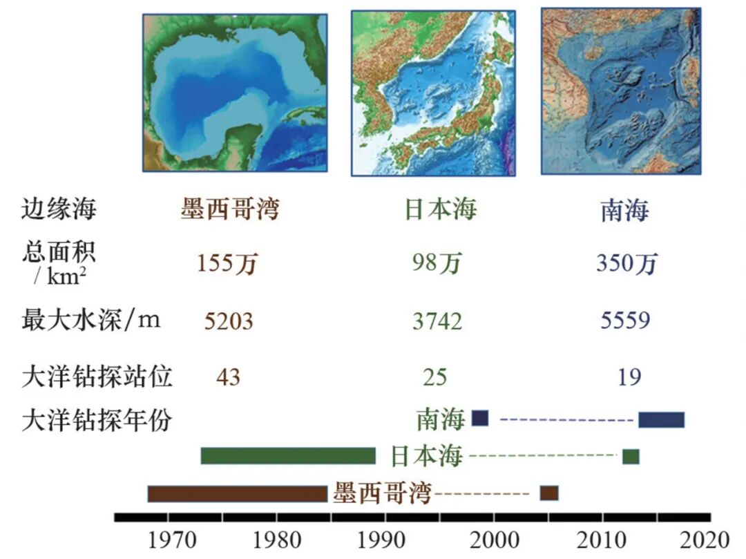当前世界上深海研究程度最高的边缘海有3个:墨西哥湾、日本海和南海。三者相比,南海的面积最大、海水最深,目前大洋钻探的研究程度也最高。
