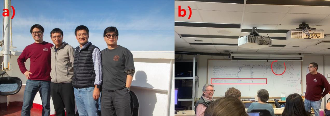 图7. a) IODP397航次上的中国科学家(从左至右):古地磁学家宣闯、地球化学家吴家望、沉积学家于际民、沉积学家庞晓雷;b) 船上科学家经过两轮不记名票选选定IODP397航次后会议的地点:中国青岛。