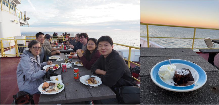 船上生活。在船上可以看到大海在不同时间不同天气下呈现出的不同颜色,与天边多变的云彩常常构成另人沉醉的美丽景象(图10),特别是在日出和日落时分,尽管我们岩芯描述组工作量很大,我们白班组还是错开时间使每个人每天都有两到三次去室外呼吸新鲜空气、晒晒太阳,欣赏大海美景的休息时间。船上的饭菜非常美味,每六个小时就有一餐,随时都有水果、甜点和冰激凌,上过船的人应该都不会忘记每周六才有的“Lava Cake”,以及室外烧烤和各种主题餐(图11)。我们在海上并不孤独,有很多海洋生物会不时的来访问我们,在第一个站位最先看到的是称为Mahi-Mahi的鱼,其学名叫鲯鳅,在水下反射太阳光会呈现出非常亮的蓝色和绿色,随着航次的进行,我们不断向陆地靠近,海洋生物也多了起来,会不时看到鲸鱼、海豚和海鸥。